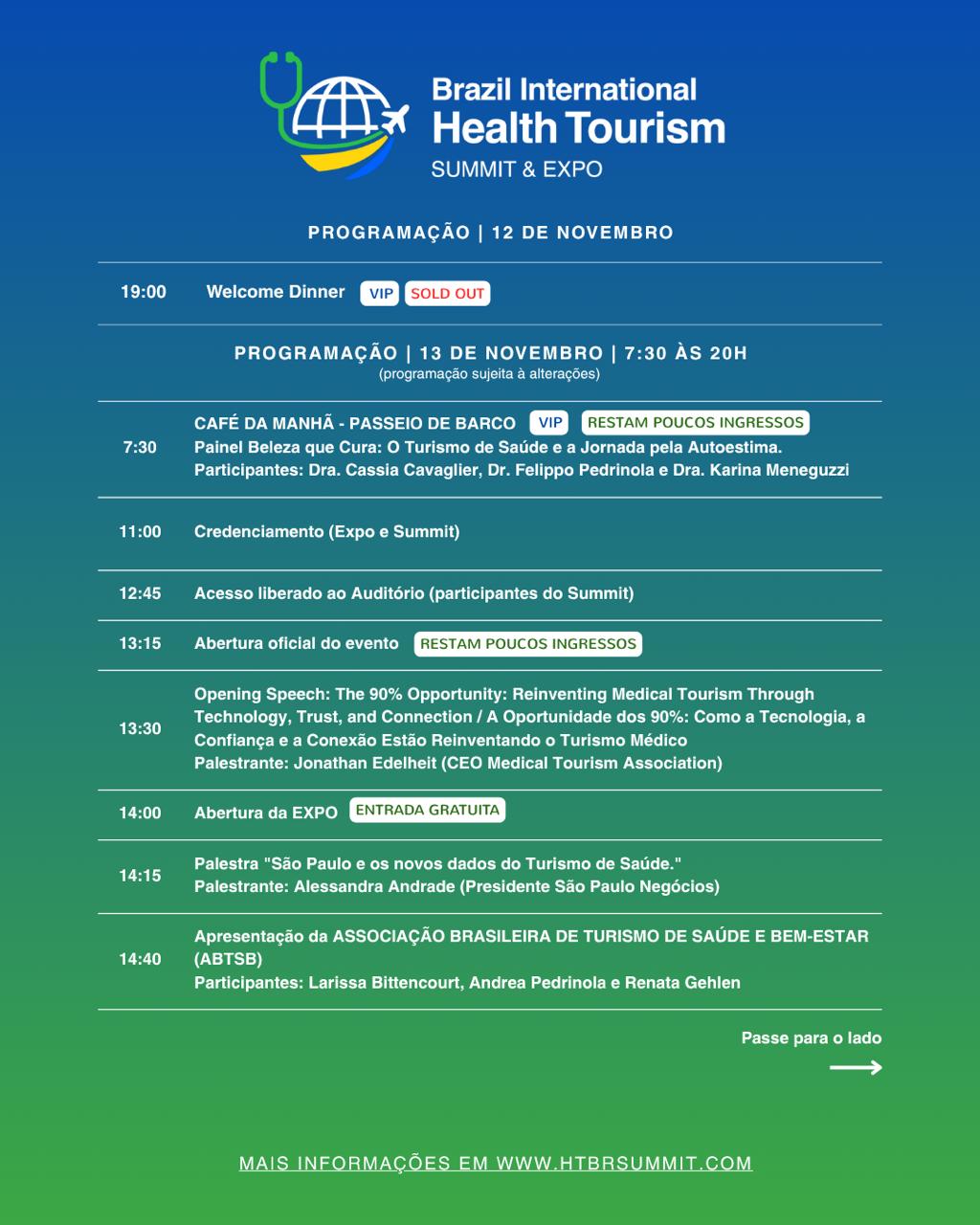 É o primeiro evento realizado no Brasil voltado ao turismo de saúde e medicina integrativa, reunindo especialistas, clínicas e entidades nacionais e internacionais. Serão dois dias de evento com programação intensa de palestras e área para expositores apresentarem soluções. Uma oportunidade única e exclusiva de criar conexões e conhecer o potencial do turismo médico brasileiro.